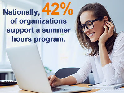 According to ASE’s data released this year in our Workplace Flexibility survey, overall 18% of employers offer a summer hours program while 28% of employers with over 500 employees offer summer hours programs. For those employers who have such a program, 38% offered it in a compressed work week format while 33% offered a partial day off. Only 5% offered a full day off, and the remaining 33% offered some other type of arrangement.