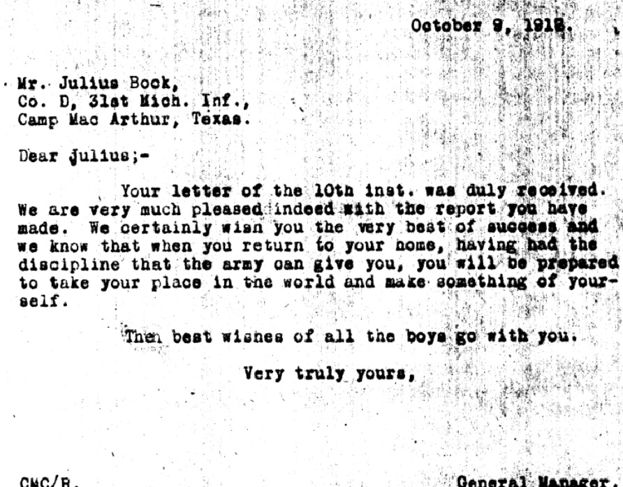 Julius Bock had cost the EAD the top employer of the Detroit area—and Ford did not rejoin until the 1950s. But neither Ford nor the EAD had Bock prosecuted for his grift. Among the surviving EAD records of that era is a letter dated September 10, 1917, from Private Bock of the 31st Michigan Infantry at Camp MacArthur, Texas, thanking Chester Culver for “letting me out of that.” “I figured I could do more for my country here than in the other place,” by which he no doubt meant jail.
